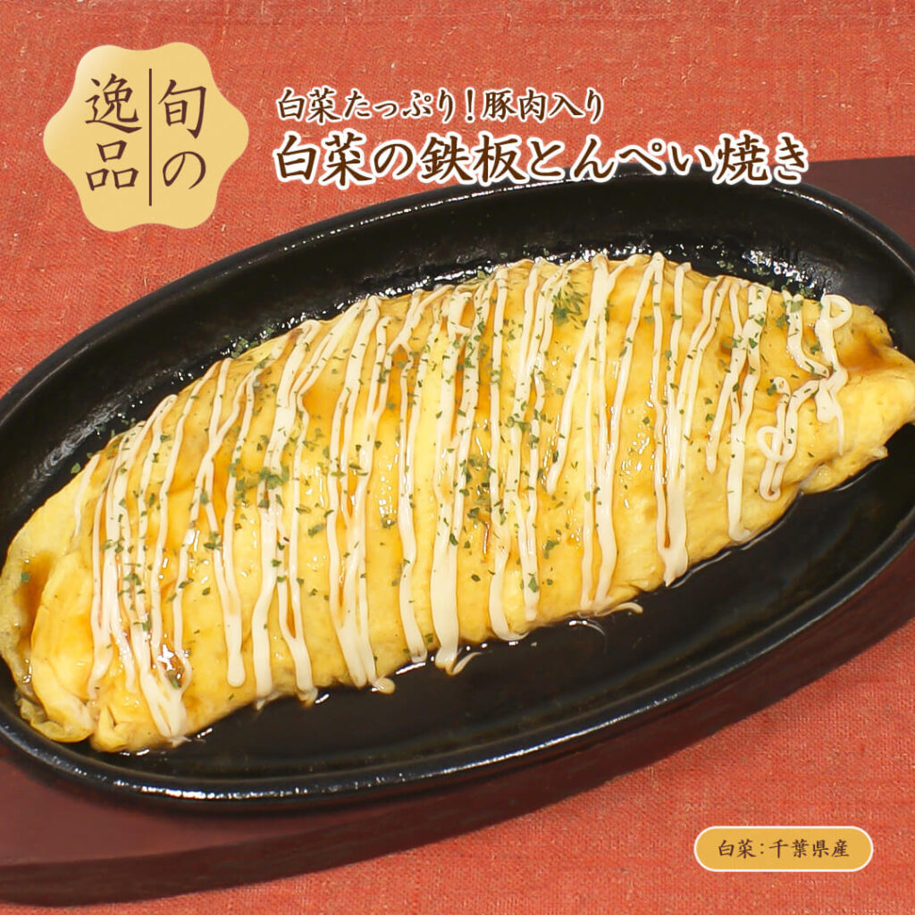 1/12(月)よりのご提供は、白菜たっぷり!豚肉入り「白菜の鉄板とんぺい焼き」&野菜2種の甘みを楽しむ「しいたけと長ネギのから揚げ」です。