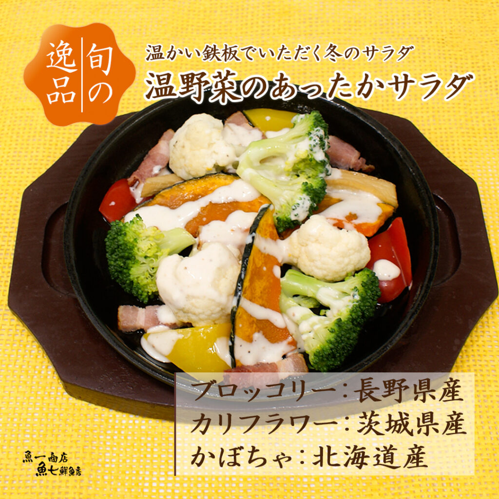 期間限定!旬野菜を使った夜メニューです。今月は、温かい鉄板でいただく冬のサラダ「温野菜のあったかサラダ」と甘みがあるれんこんの香ばしいおつまみ「れんこんチーズ焼き」